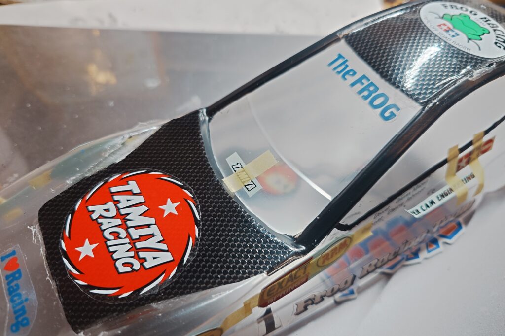 ネオ マイティフロッグというボディなので、マイティフロッグを踏襲してピンク色にしたのと、ボンネットや屋根をカーボン調シールで黒くしてみたぞ。