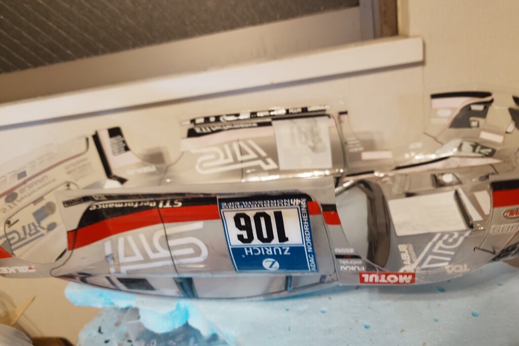 ひと通りシールを裏張りしたので、もともとの台紙を剥がして、ポリカーボネートのクリアーを吹いた。両面テープで貼った隙間を埋めるコーティングの意味で。